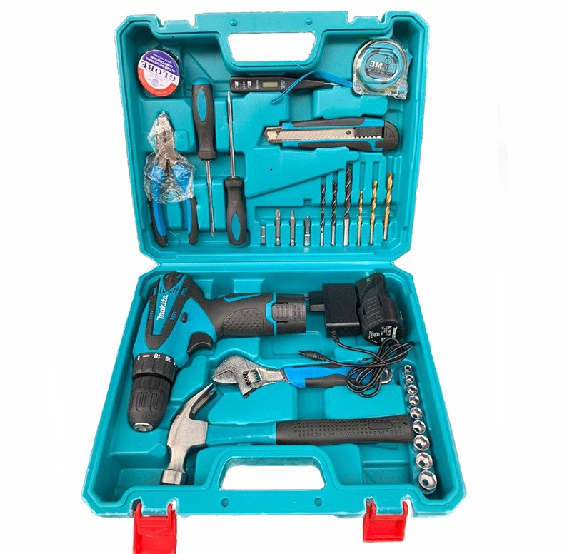 Варто зазначити також і комплектацію, адже, крім самого пристрою, у пластмасовому кейсі до нього йде також і великий набір інструментів різного типу та призначення. У наборі інструментів представлений: прилад для вимірювання струму, кусачки, пара викруток (хрестова та пряма), канцелярський ніж, розвідний ключ, молоток із цвяходером, рулетка-сантиметр, чорна ізострічка, набір головок під гайки, набір біт і набір свердел для свердління дерева та металу. Разом з основним акумулятором, до комплекту входить також і другий. Це дасть змогу використовувати пристрій удвічі довше, просто чергуючи між собою два акумулятори. До комплекту входить імпульсний зарядний пристрій для батарей, що працює від мережі 220 В.
