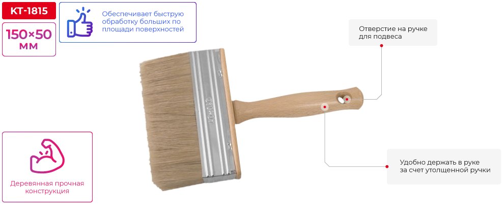 Завдяки щільній натуральній щетині зручно наносити в'язкий матеріал. Ворс стійко переносить агресивні середовища та не випадає, надійно зчеплений зі сталевим корпусом обойми.